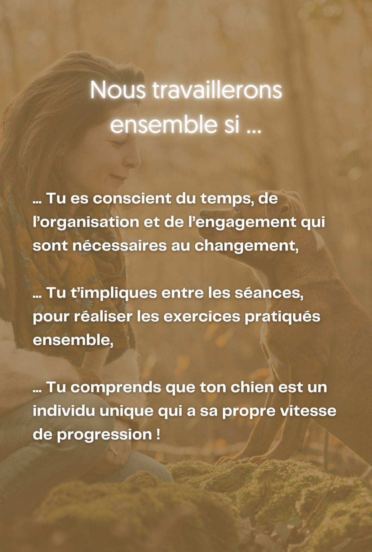 Je viens d’abord évaluer la situation à domicile, sans jugement, en discutant avec toi en présence du chien. J’observe tes interactions avec le chien, et la place qui lui est donnée.